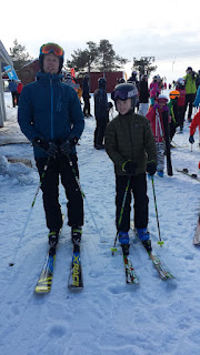 Backarna var helt okej, väldigt barnvänliga och flacka. Det fanns bara en svartbacke och en rödbacke som var öppna alla andra var blå vilket Vincent tyckte var bra. Men det fanns inte så mycket snö utanför backarna, där var det lersörja. Kan säga att vår bil ser inte så fin ut nu….. haha