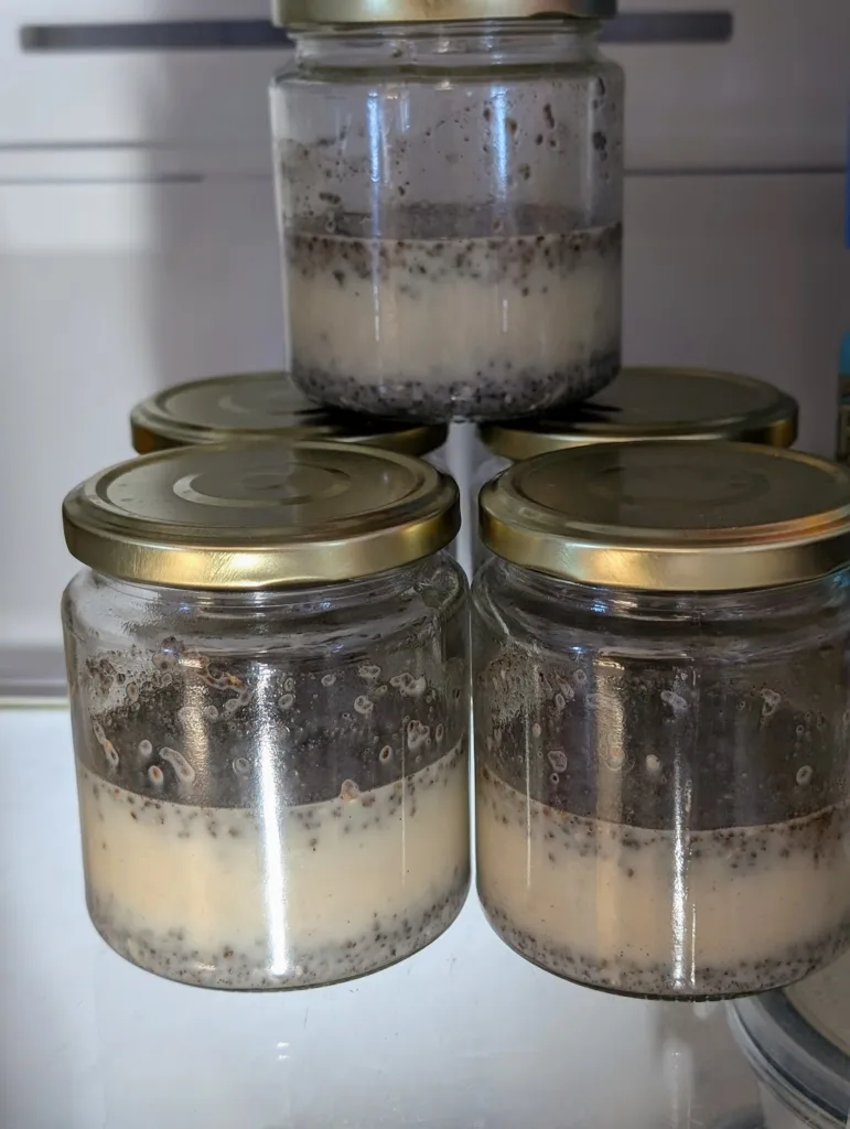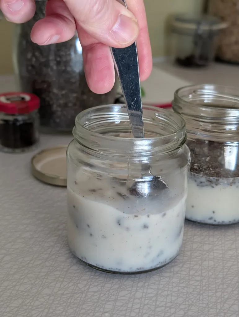 Sedan får burkarna stå i kylen och svälla till sig, rör runt lite då och då. På morgonen toppar jag med frysta hallon innan jag drar till jobbet. Klart på någon minut – och kroppen får något riktigt bra att starta dagen med.