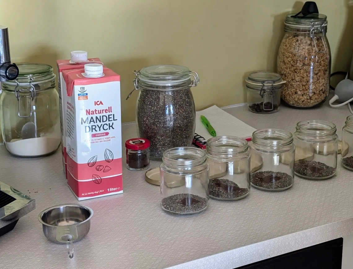 Så numera har jag en liten söndagsrutin. Jag gör sex burkar chiapudding på en gång, så frukosten redan står redo i kylen hela veckan. En sån där enkel vana som gör morgnarna lite lugnare.