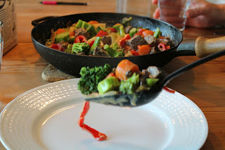 I lördags hade vi våra vänner över, Linda och Ingvar med barnen. Vi bjöd på grillad ryggbiff med kappa, ugnsbakade rotfrukter och kantarellsås. Barnen fick köttbullar med potatis och brunsås. Nästan allt gick åt men det blev över 2 skivor ryggbiff, liiite sås och lite grönsaker.
