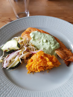Jag serverad en groddsallad (med zucchini och rödlök) och mosad sötpotatis till, men välj det du vill ha.