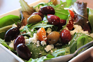 Vi serverade en sallad med tomater, oliver och smulad fetaost, häll över lite fin olivolja. Mums! Till Vincent serverade jag lite ris. Alla nöjda och mätta!