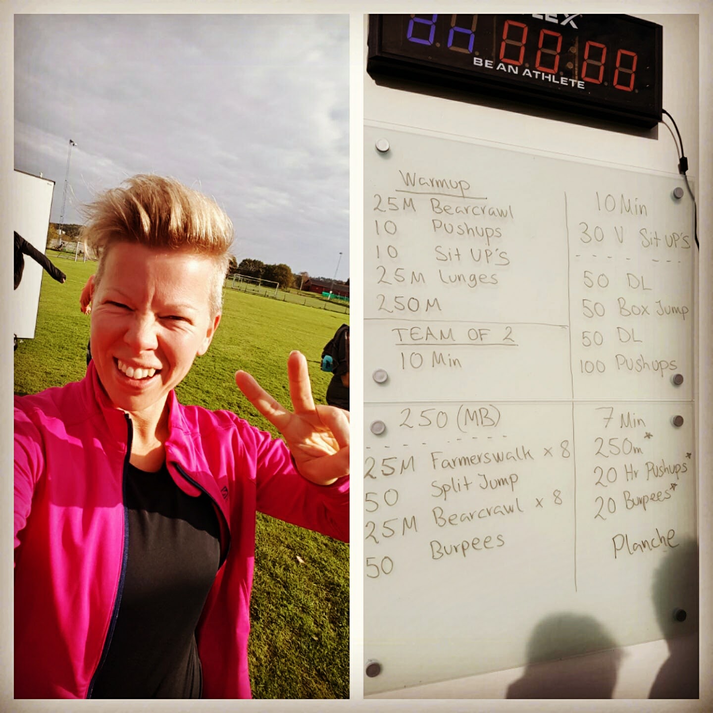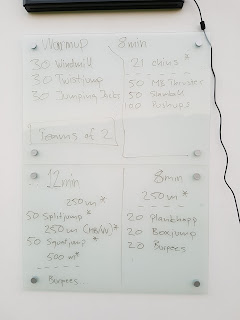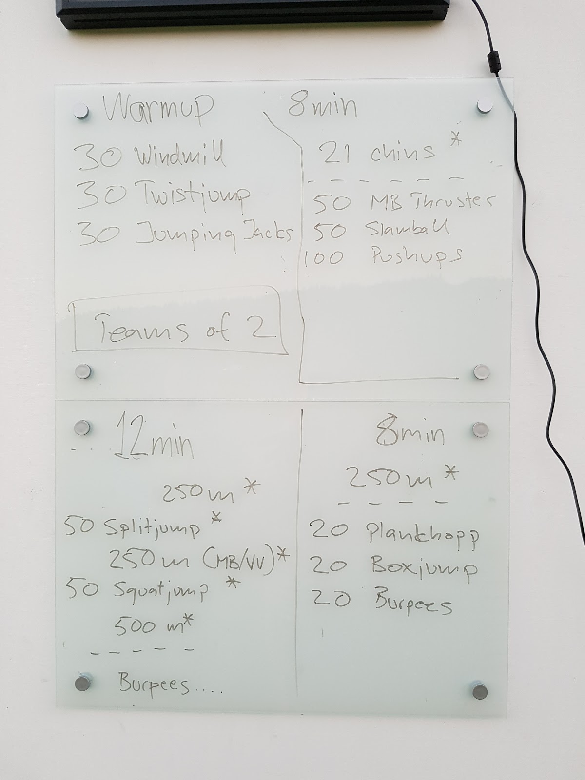 Det är en ny utmaning/pass varje dag kombinerad kondition och styrka. Man jobbar två och två, en utför övningen medan den andra vilar x-antal sekunder som övningen tar.