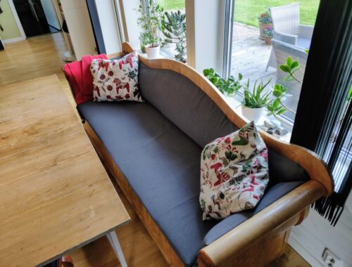 Jag har massa frågor av er via Instagram, jag har nämligen bytt tyg på en kökssoffa. Den kommer från min pappas släktgård och är gjord 1873, den 27 maj i Prästhyttan. Så himla roligt att ha en sån gammal kökssoffa…