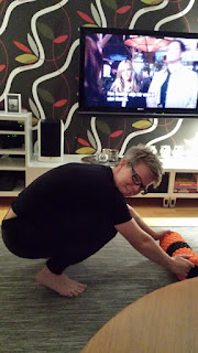 Så här ser vi ut framför tv. För att kunna stå kvar behöver jag mina armar för att kunna balansera. För att kunna stå på hela foten måste Anders hålla i mig, om han inte gör det så tippar jag bakåt.