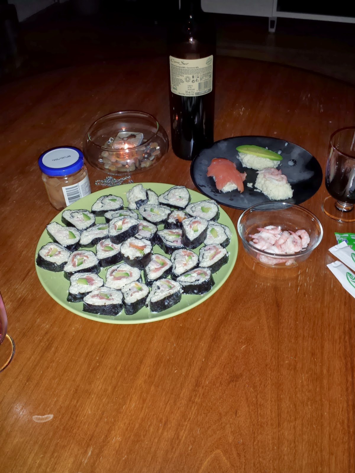 När det svalnat så rör ner philadelphiaost, risvinäger. Sedan är det bara till att göra den typen av maki som ni gillar! Vi hade kallrökt lax, räkor, avokado och majonnäs.