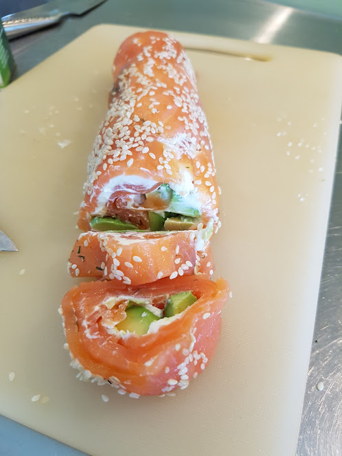 Lägg plast/gladpack över en skärbräda. Strö ut sesamfrön över plasten. Lägg ut gravad lax omlott så att det blir en fyrkantig ruta. Bred sedan ut ett lagom lager med färskost Skiva avokadon, lägg som ett band över laxen. Rulla nu ihop allt med hjälp av plasten/gladpacken. Packa ihop den nu och lägg i frysen en stund, ca 30 min