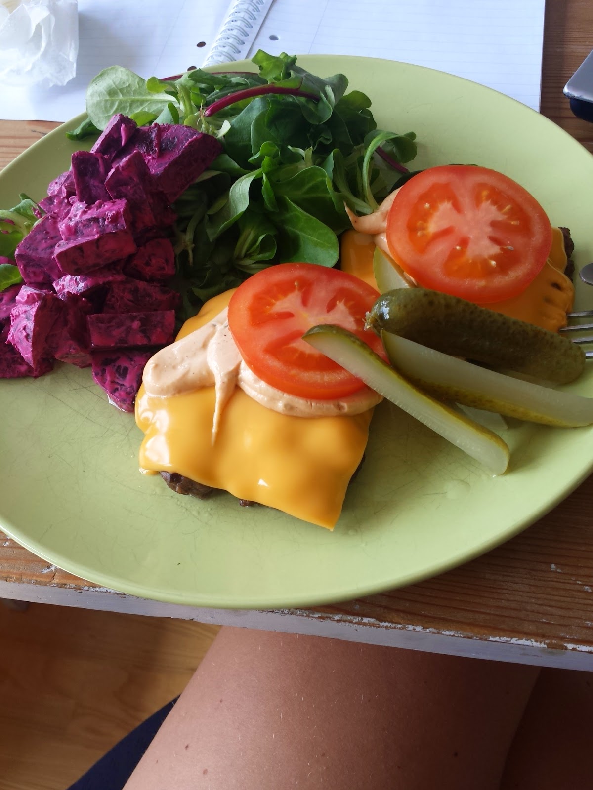 Vi har grillat hamburgare, kött och fläsk kött. Sötpotatis, vanlig potatis och gjort tzatziki mums….